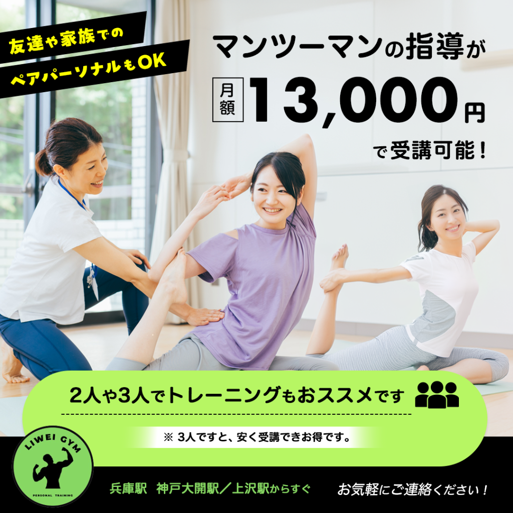神戸市兵庫区の“LIWEI GYM(ライウェイジム)”ではダイエットやボディメイクはもちろん、アスリート向けのトレーニングやピラティス、腰痛・肩こりなどの慢性的な痛みへのアプローチなど多彩なメニューをご用意しているパーソナルジムです。