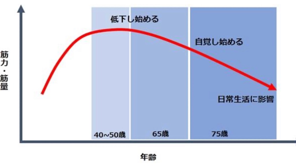 簡単に言いますと、加齢に伴い筋肉量が減少していく現象です。また図の通り50歳を越えてからは急激に右肩下がりで落ちてきます。